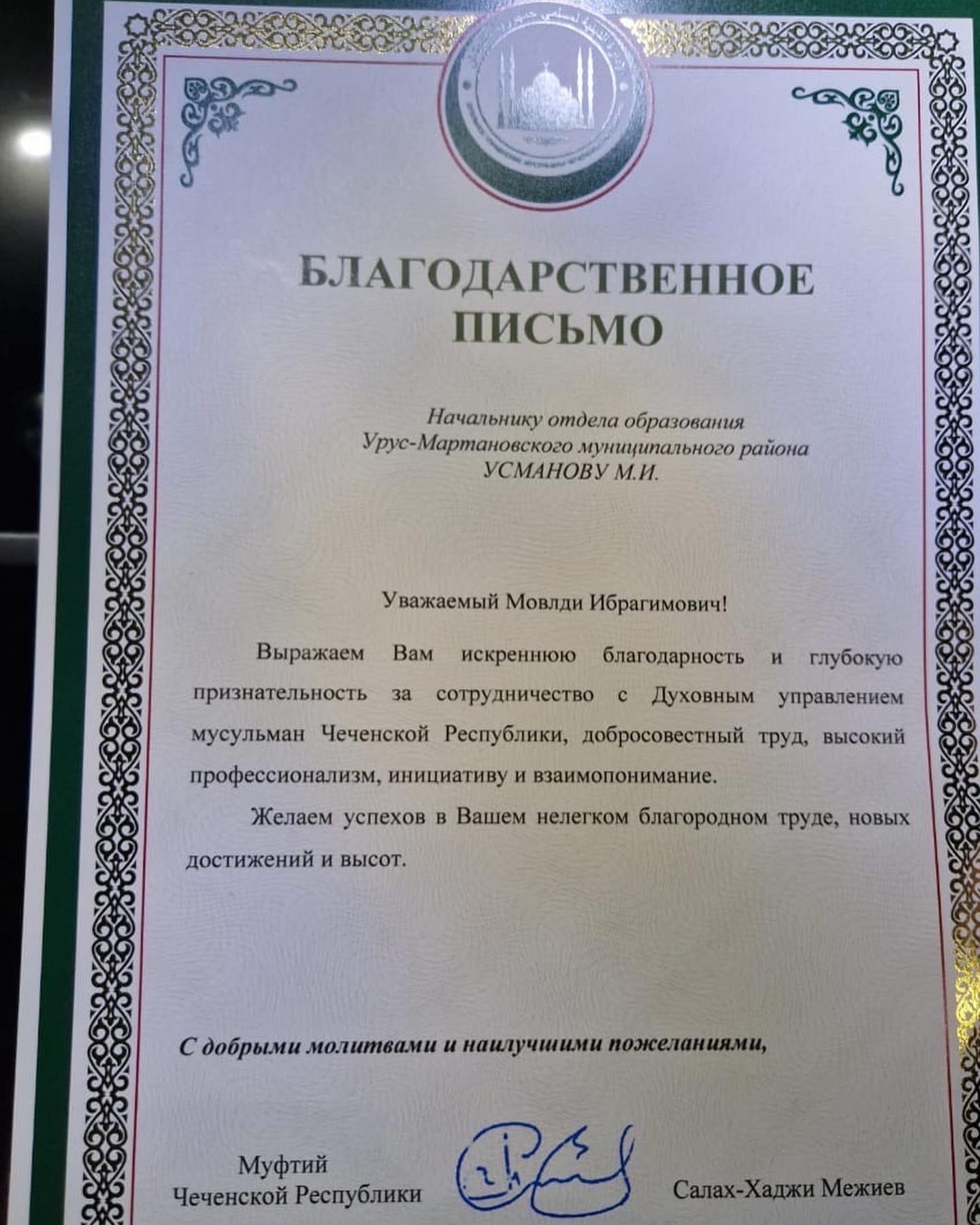НАЧАЛЬНИК РАЙОННОГО ОТДЕЛА ОБРАЗОВАНИЯ М. УСМАНОВ НАГРАЖДЕН БЛАГОДАРСТВЕННЫМ ПИСЬМОМ МУФТИЯ ЧР21.11.2022г.
