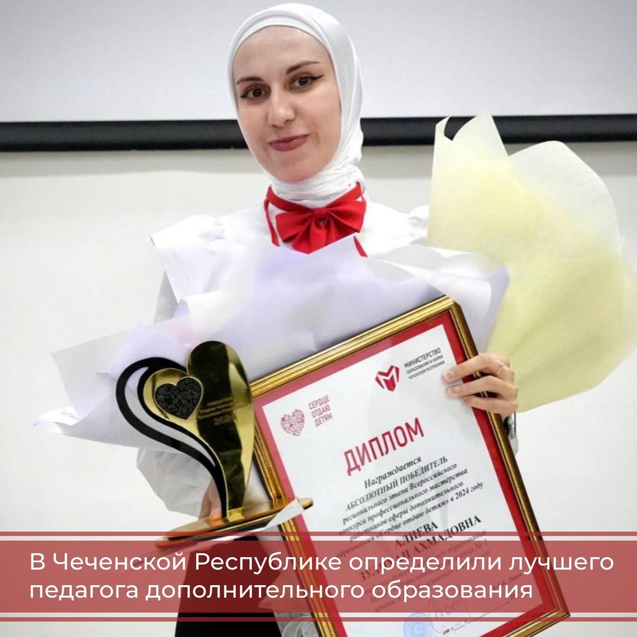 10.06.2024В ЧР объявлен победитель регионального этапа Всероссийского конкурса профессионального мастерства работников сферы дополнительного образования «Сердце отдаю детям». Им стала Зулихан Алиева, педагог дополнительного образования Математической школы № имени Х.И. Ибрагимова г. Грозного.Конкурс «Сердце отдаю детям» является главным педагогическим соревнованием в системе дополнительного образования детей.Основная цель конкурса – повышение значимости и престижа профессии педагогического работника в сфере дополнительного образования, а также выявление лучших практик и педагогических кадров.В этом году Грозный представляли четыре педагога дополнительного образования. Они прошли четыре конкурсных испытания.На всех этапах Зулихан Алиева демонстрировала отличные результаты, благодаря чему стала абсолютной победительницей. Кроме того, она одержала победу в номинации «Художественная направленность».Теперь педагог из Грозного будет представлять Чеченскую Республику в финале всероссийского конкурса «Сердце отдаю детям».Победительнице вручили ведомственную награду и статуэтку, а также денежное вознаграждение от Регионального общественного фонда имени Ахмата-Хаджи Кадырова в размере 100 тысяч рублей.
